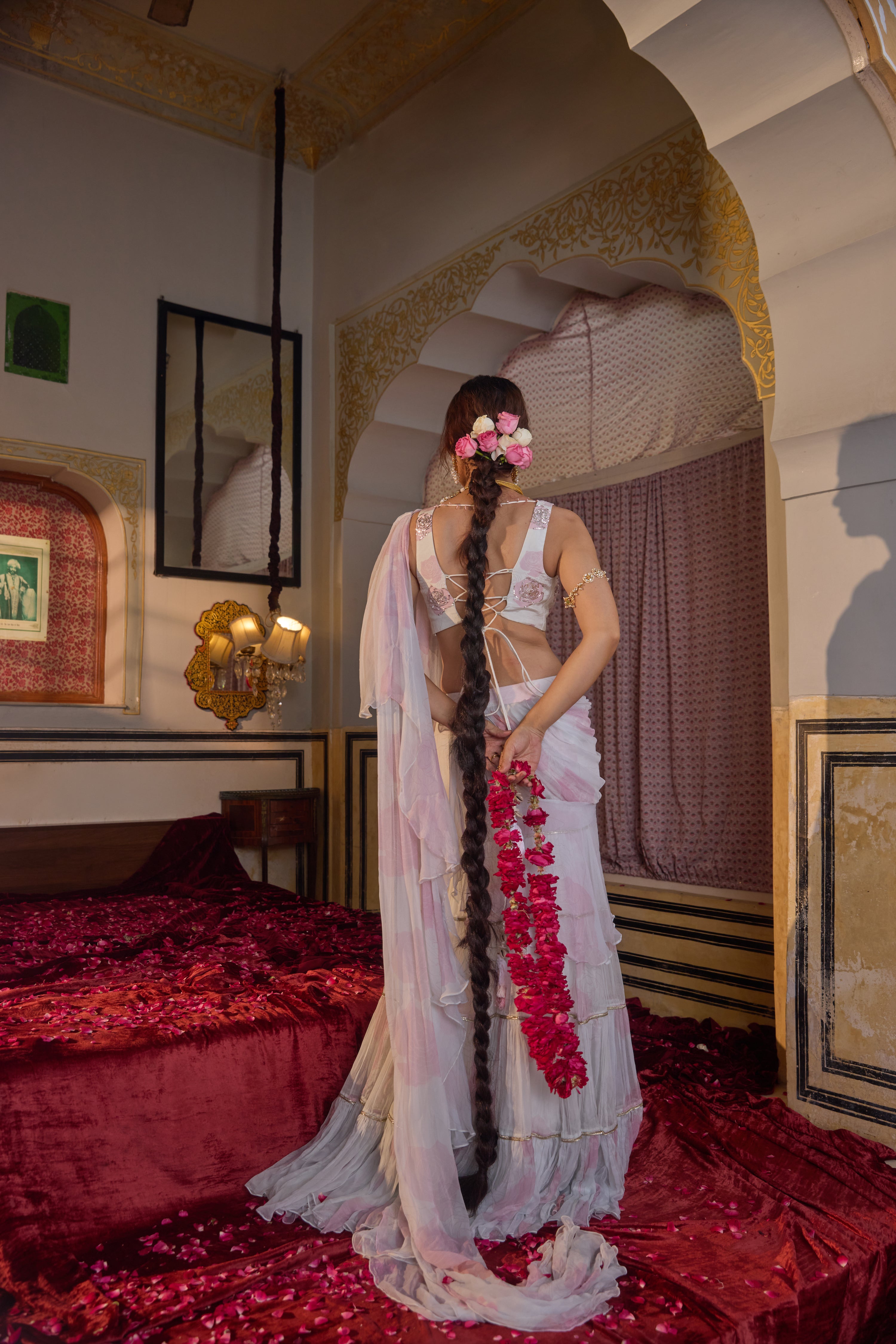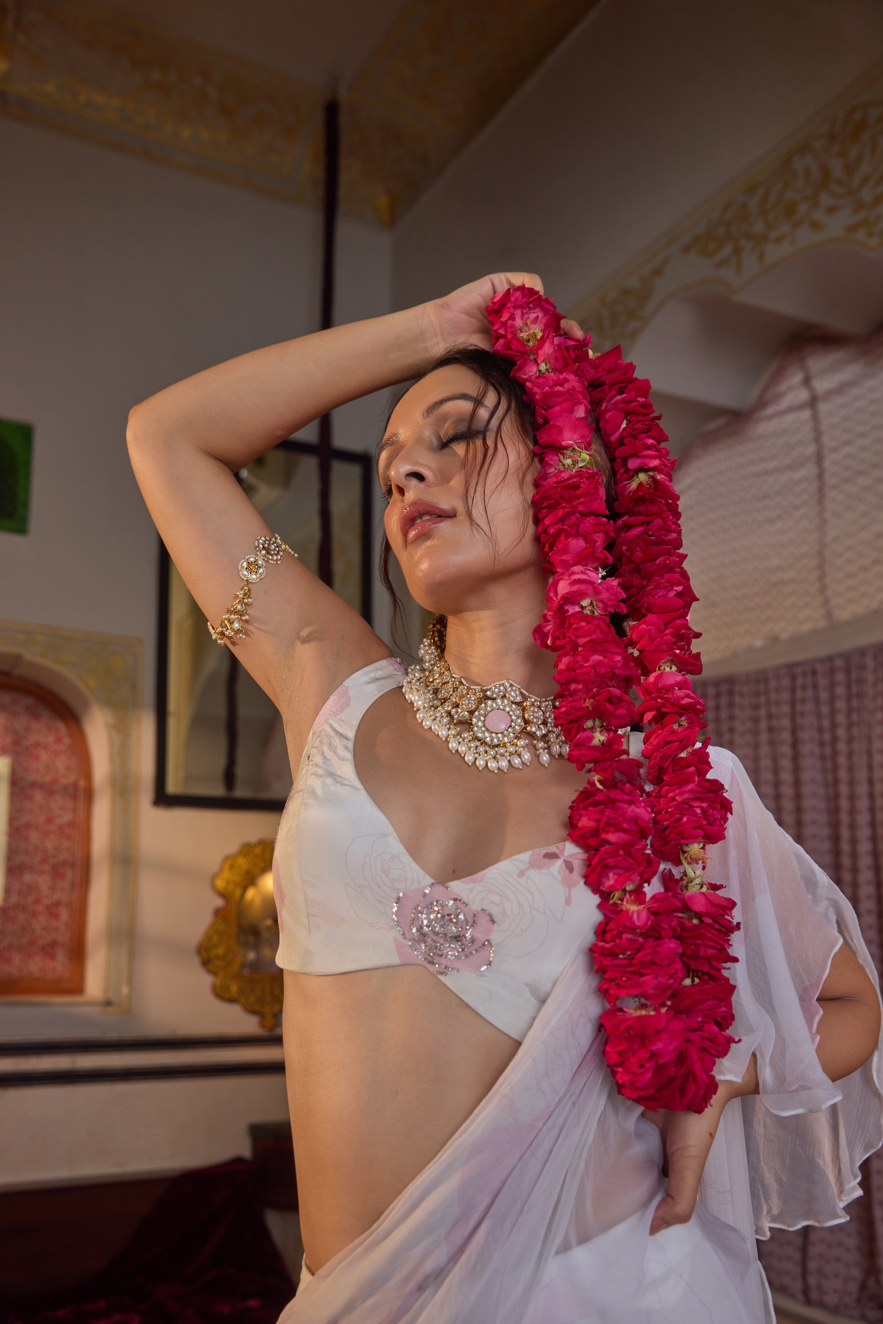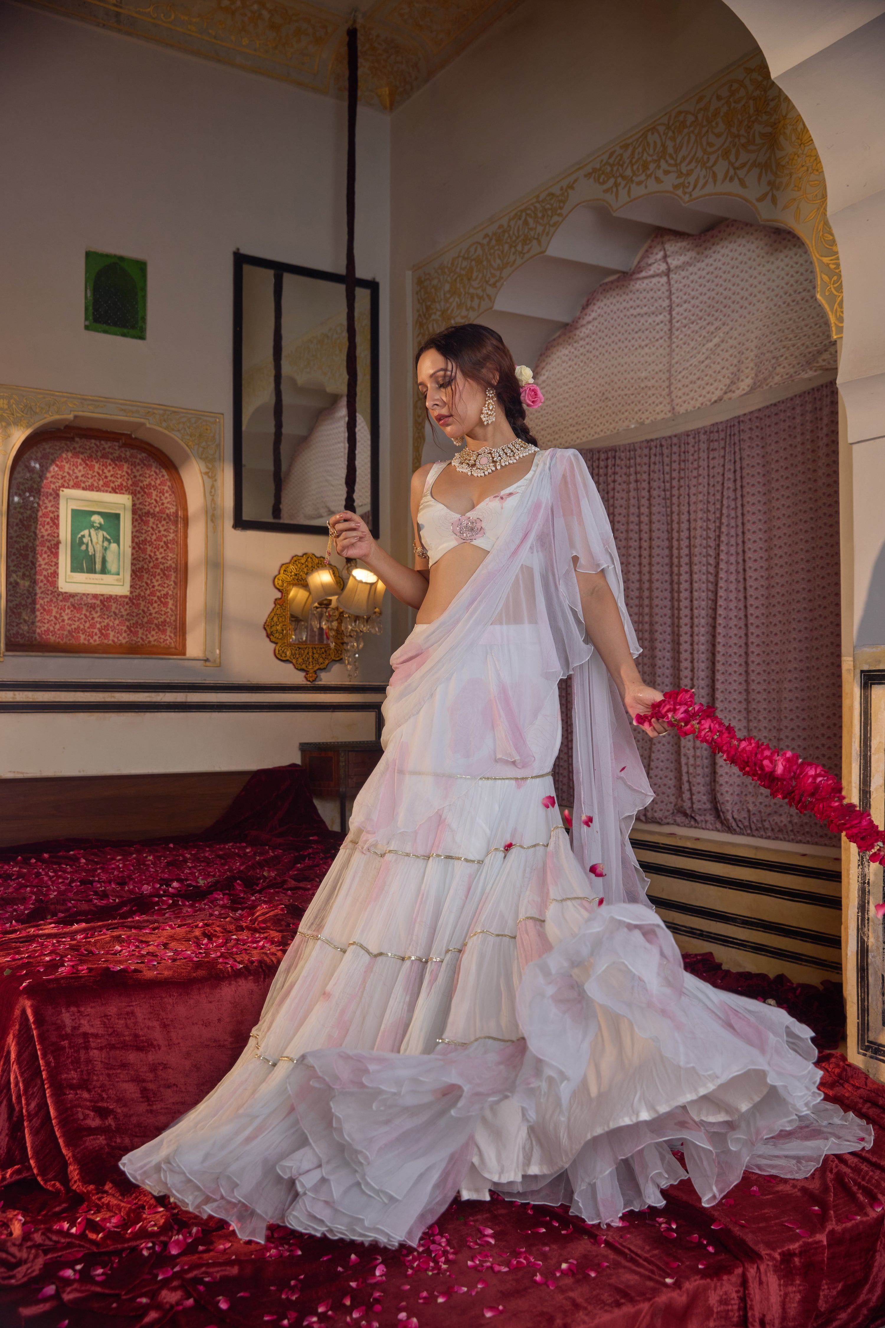 A ruffled pre-draped chiffon saree with an all-over rose pattern, paired with a deep-neck hand-embroidered blouse for effortless elegance and artisanal charm.