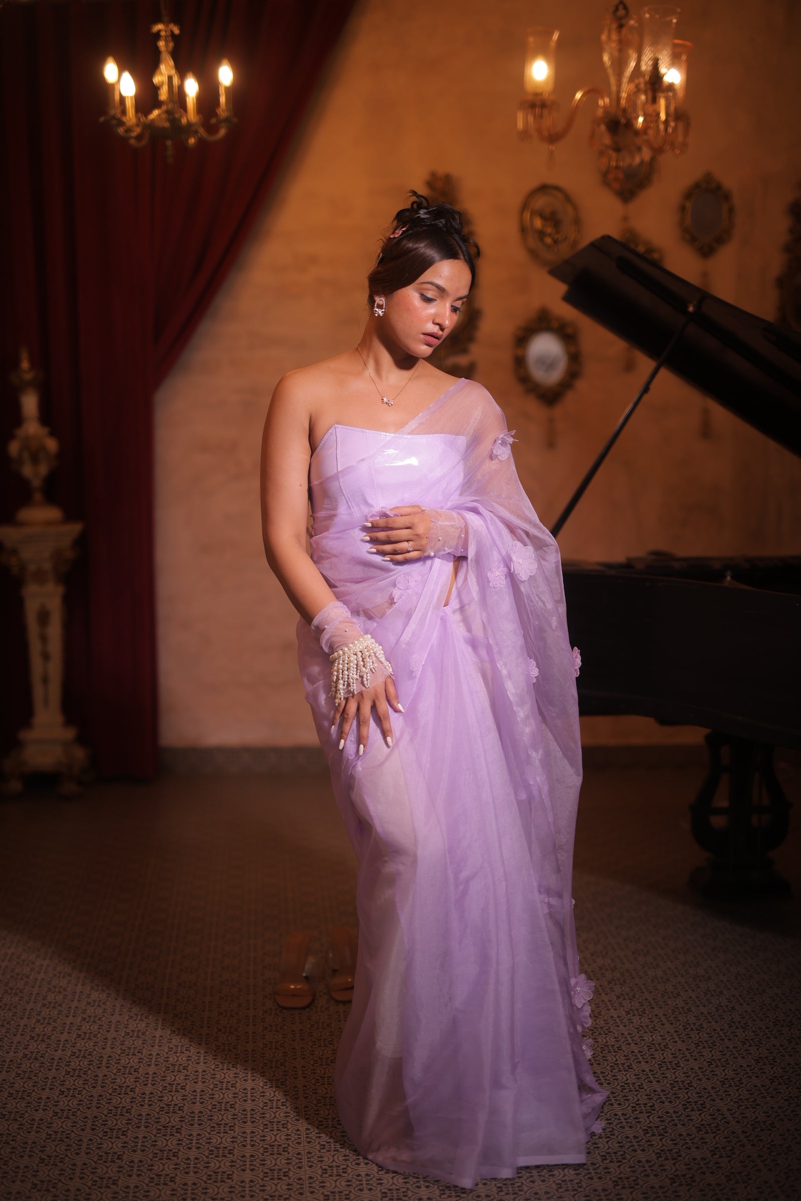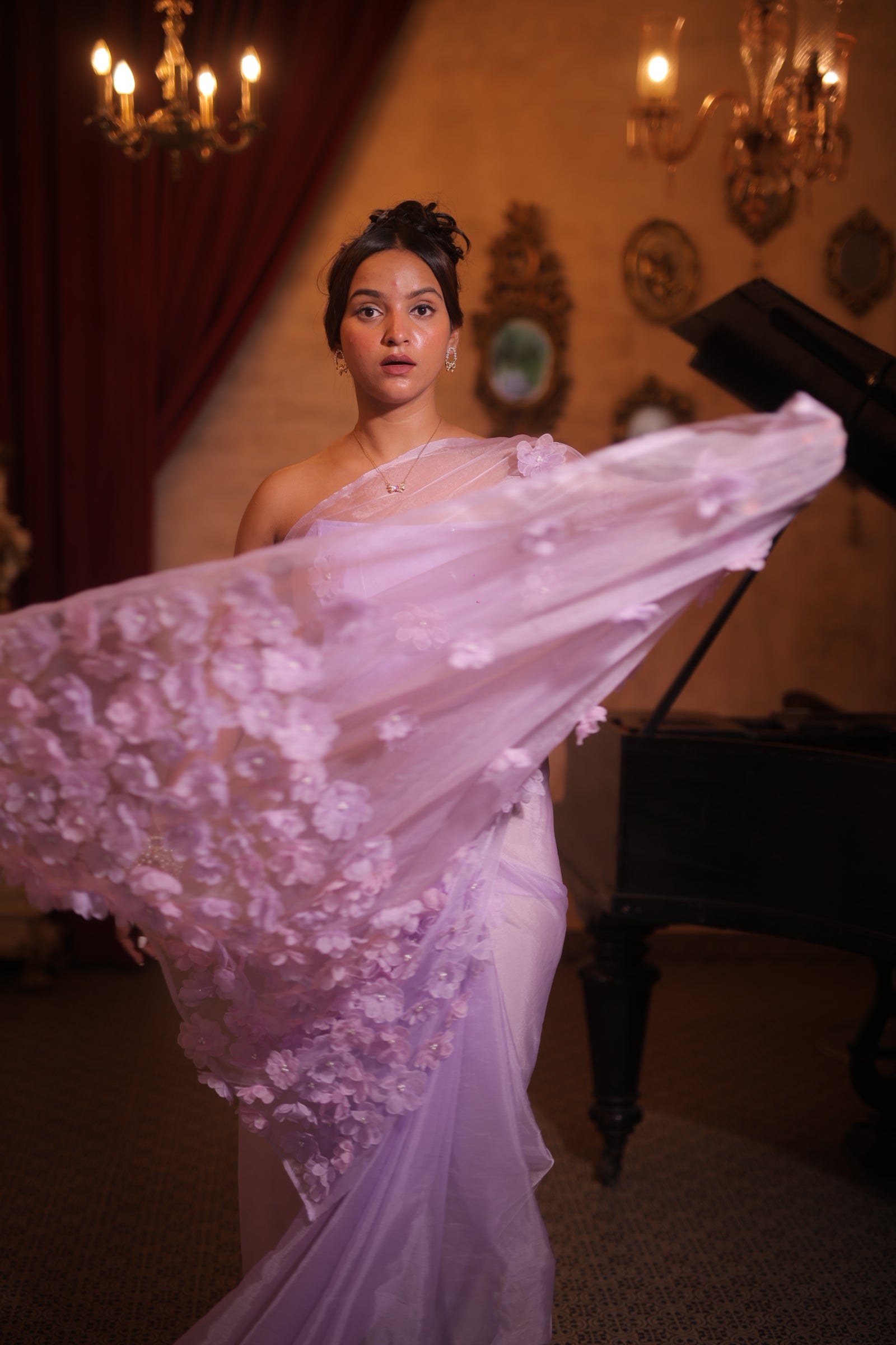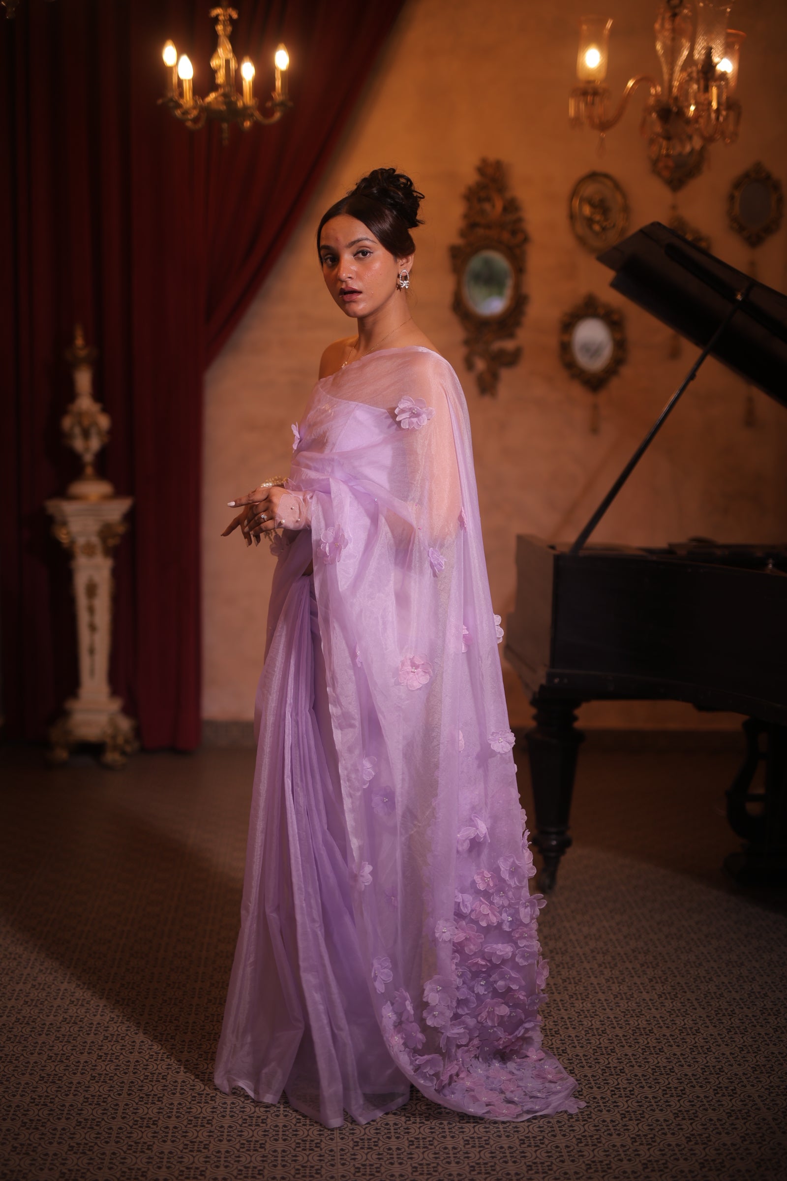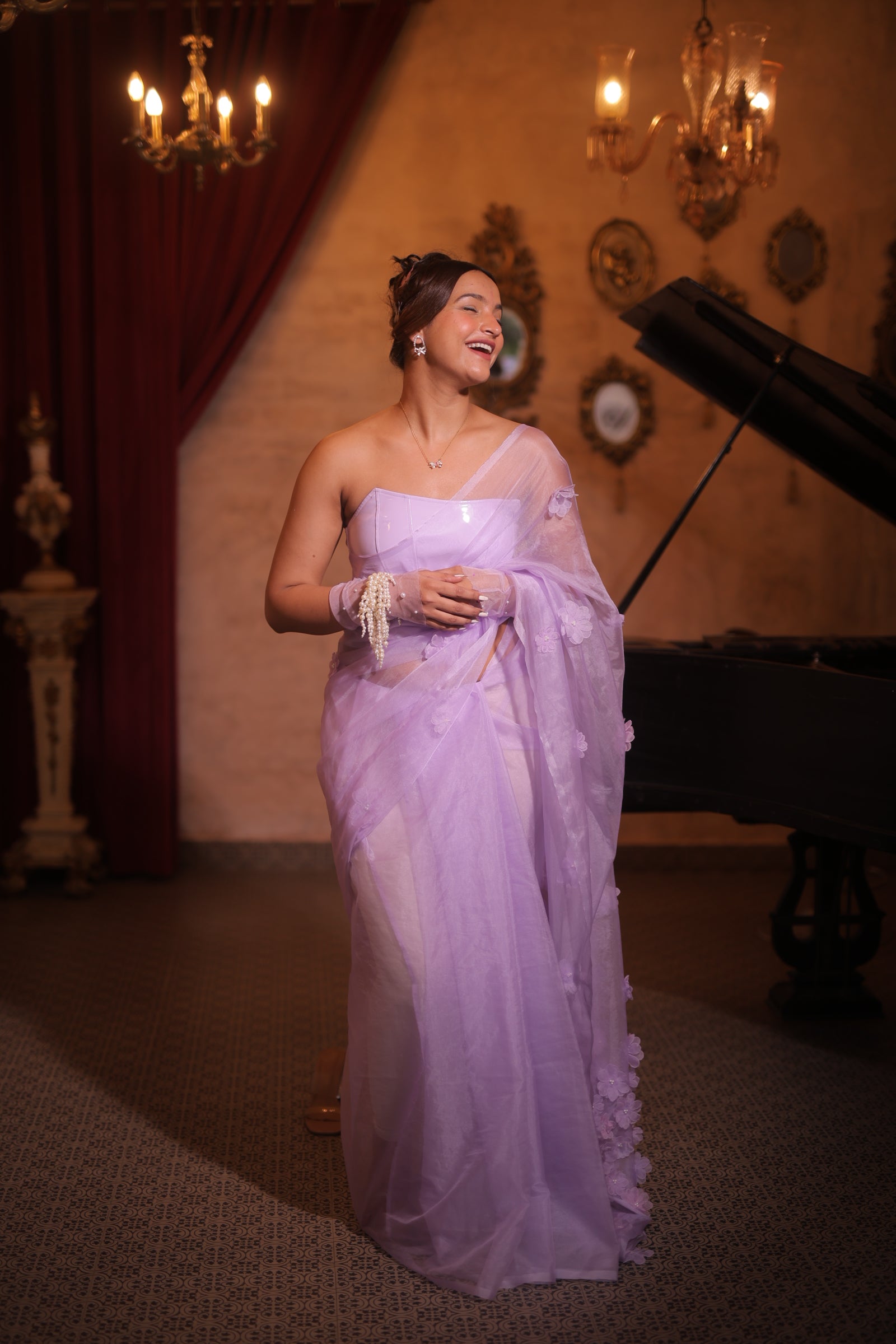 Presenting a feminine lilac organza saree adorned with 3D floral cutwork on the pallu, paired with a matching lilac leather corset blouse for a chic and contemporary ensemble.