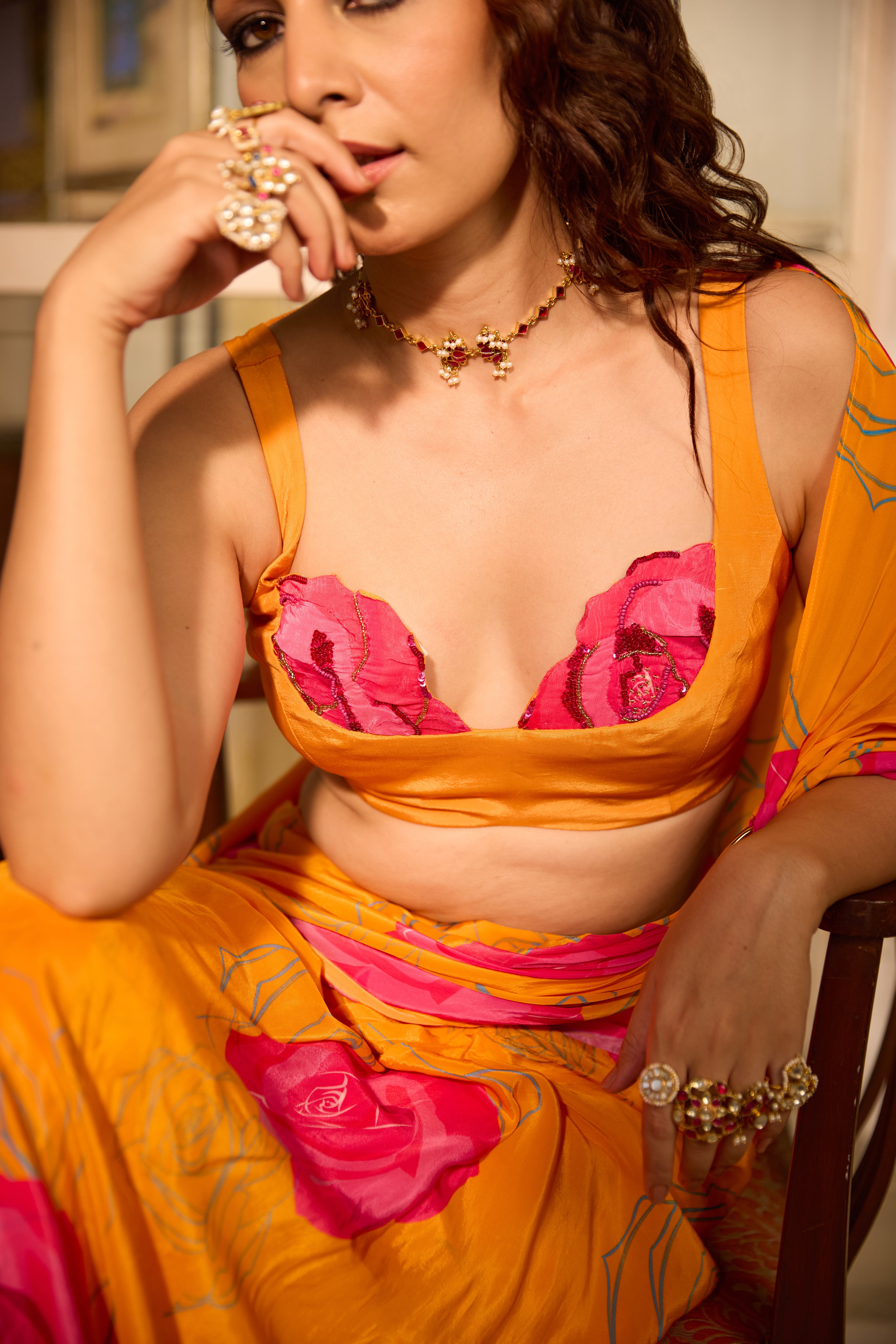 This orange pre-draped saree features a flattering silhouette that beautifully contours the body while ensuring effortless movement. Featuring a bold rose print pattern all over the saree. Paired with hand embroidered rose patch blouse sticthed on the neckline.