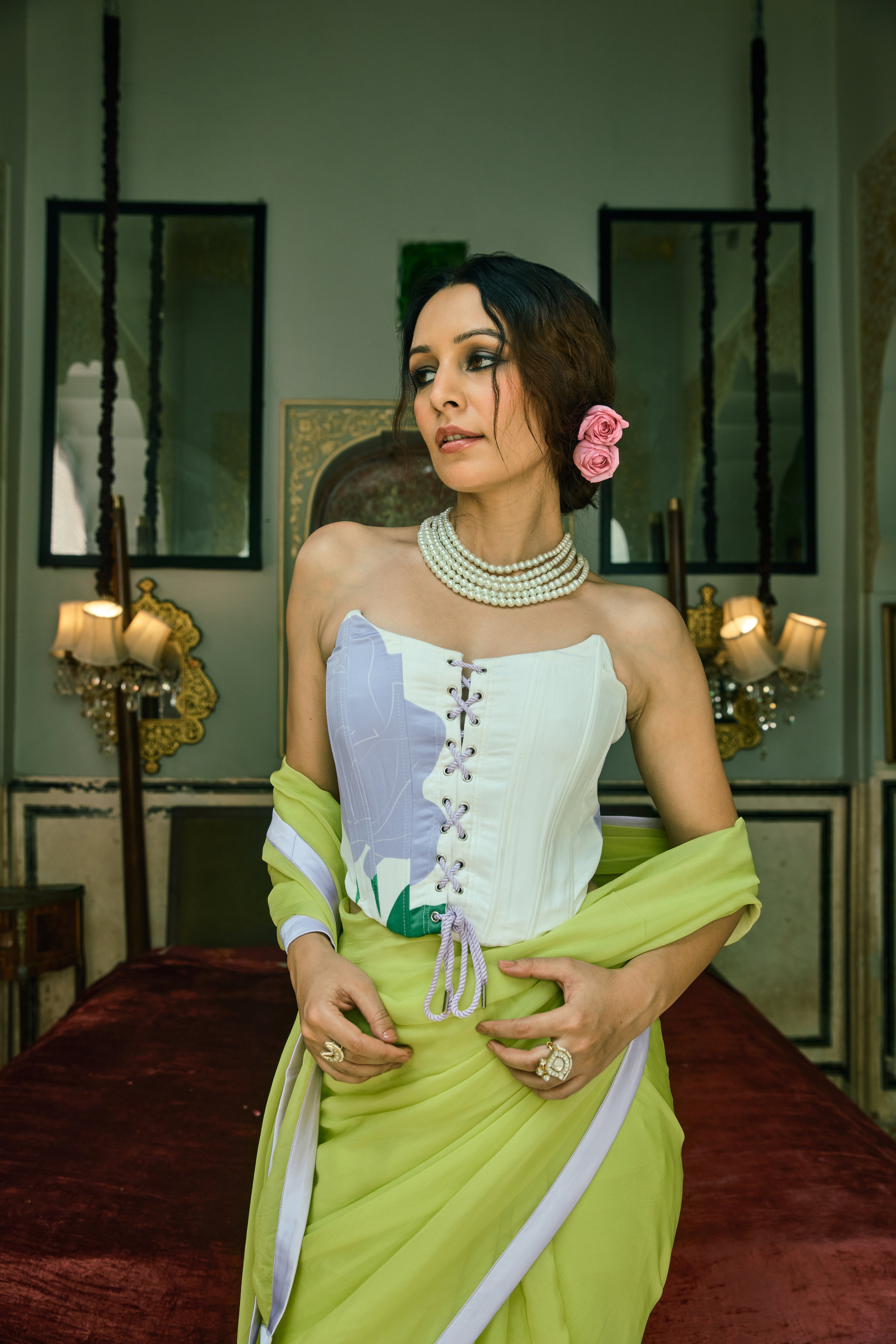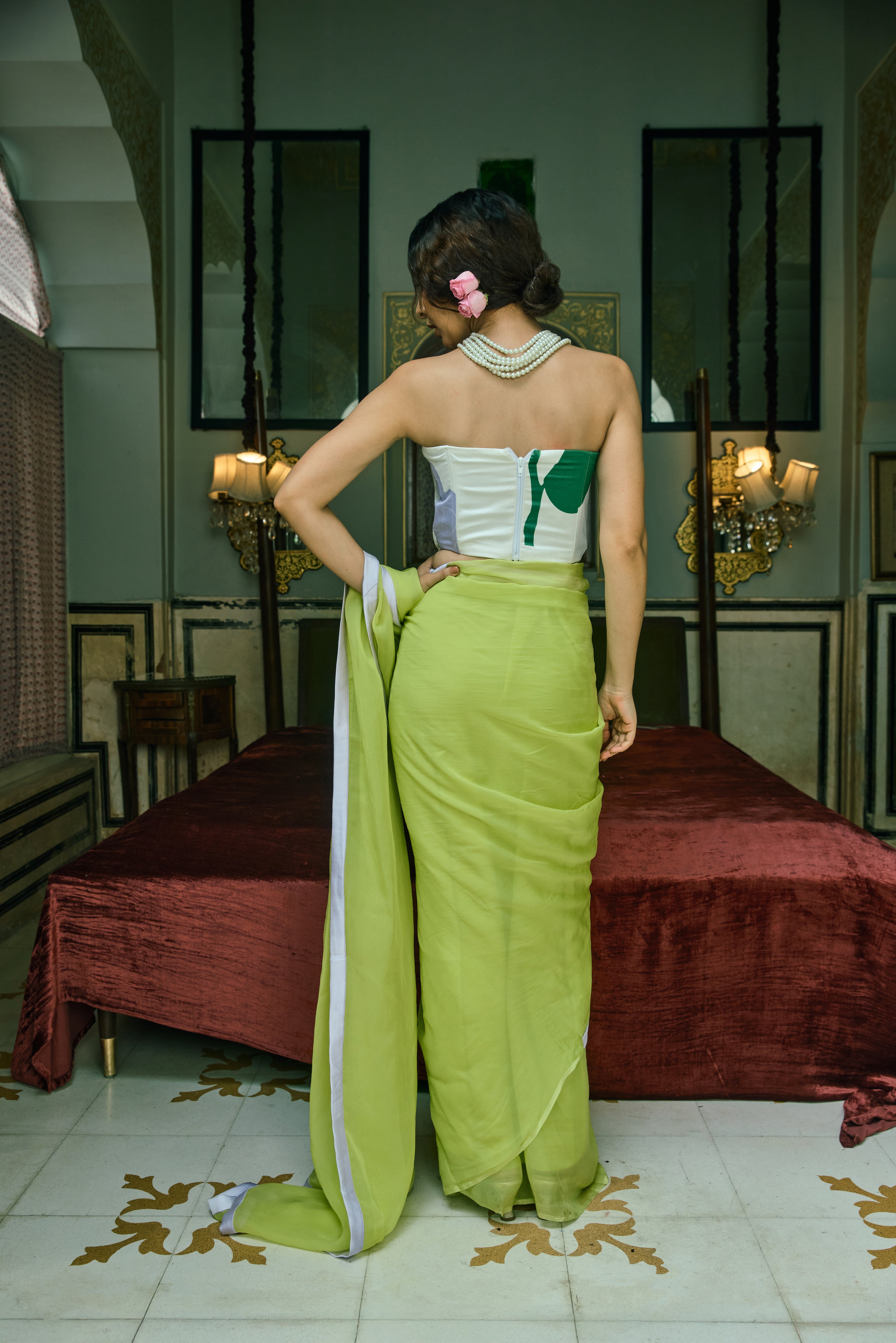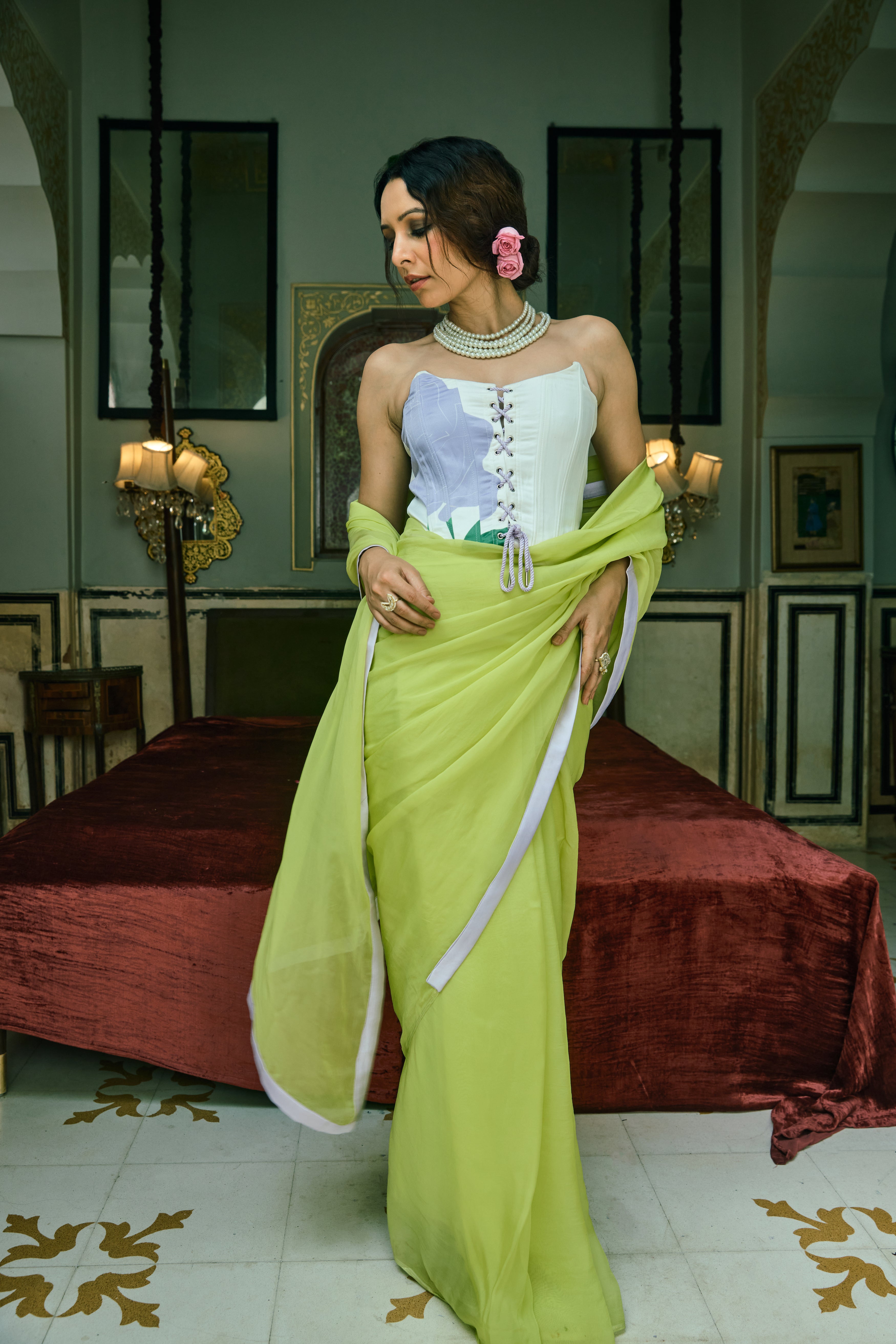 This lemon green saree in organza base paired our signature rose print corset blouse with, lace detail in the front, further enhanced the look of the saree by adding the lilac border on the hem.