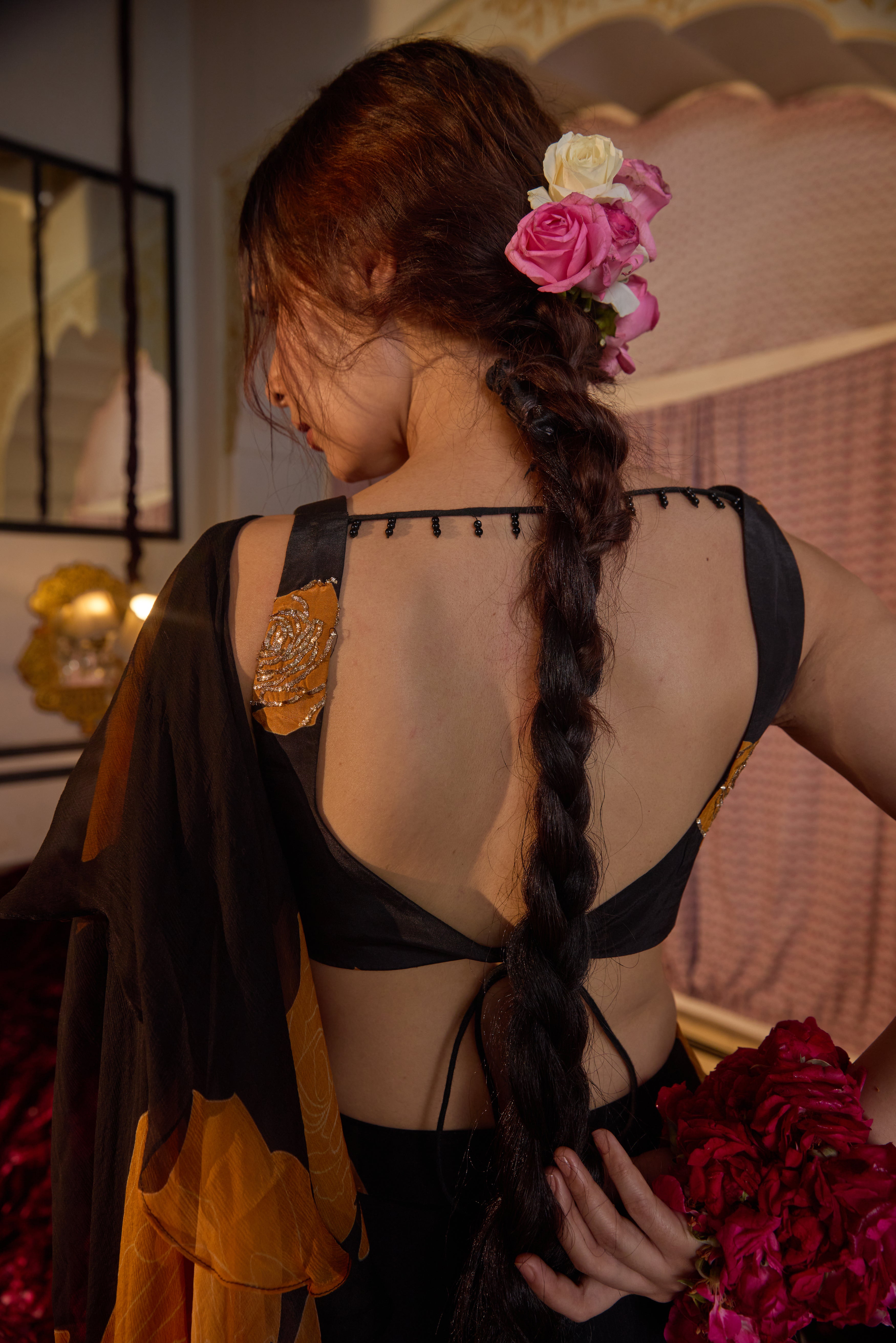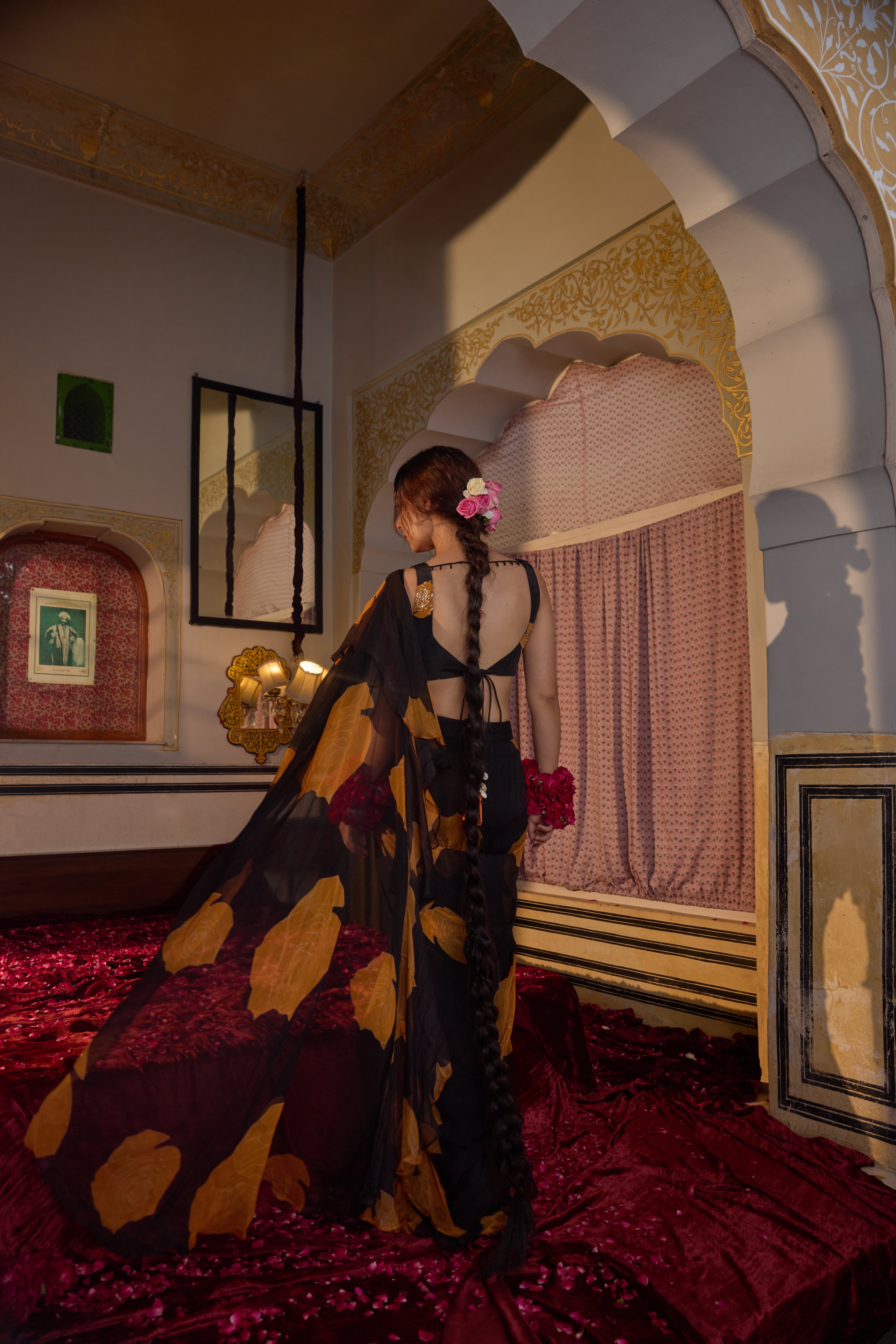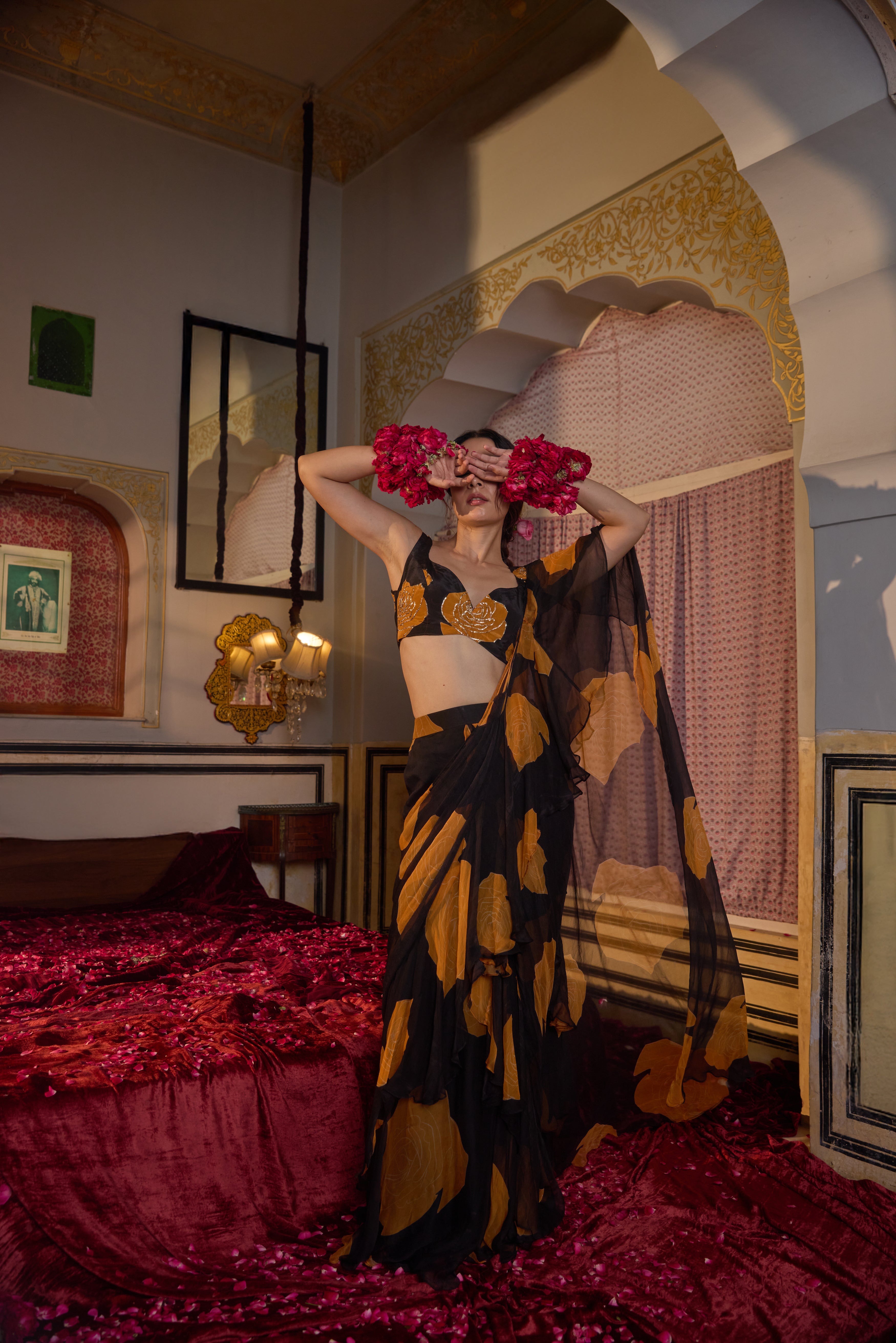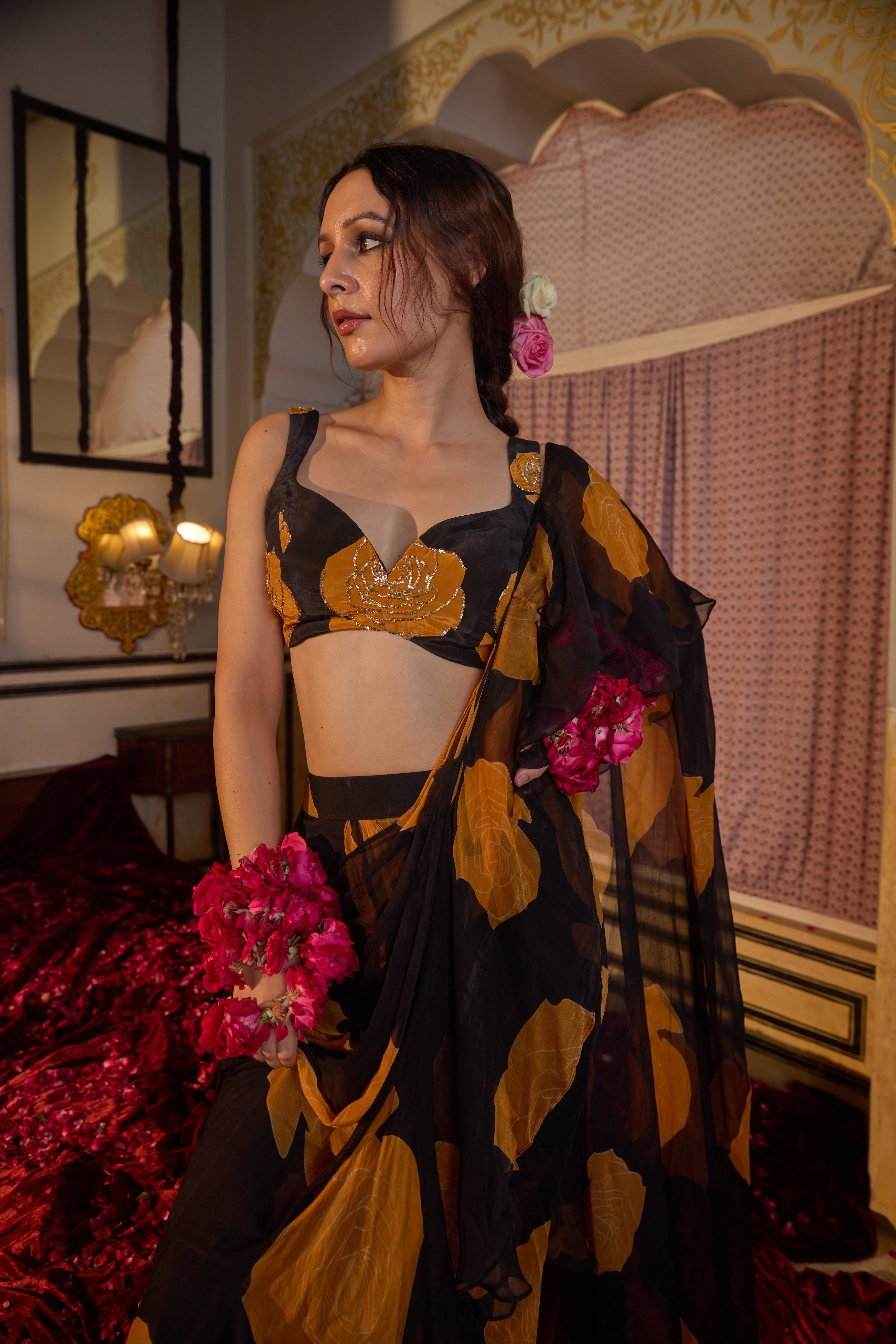 A pre-draped chiffon saree featuring black and orange rose print patterns, paired with a printed, embroidered blouse for a bold yet elegant look.