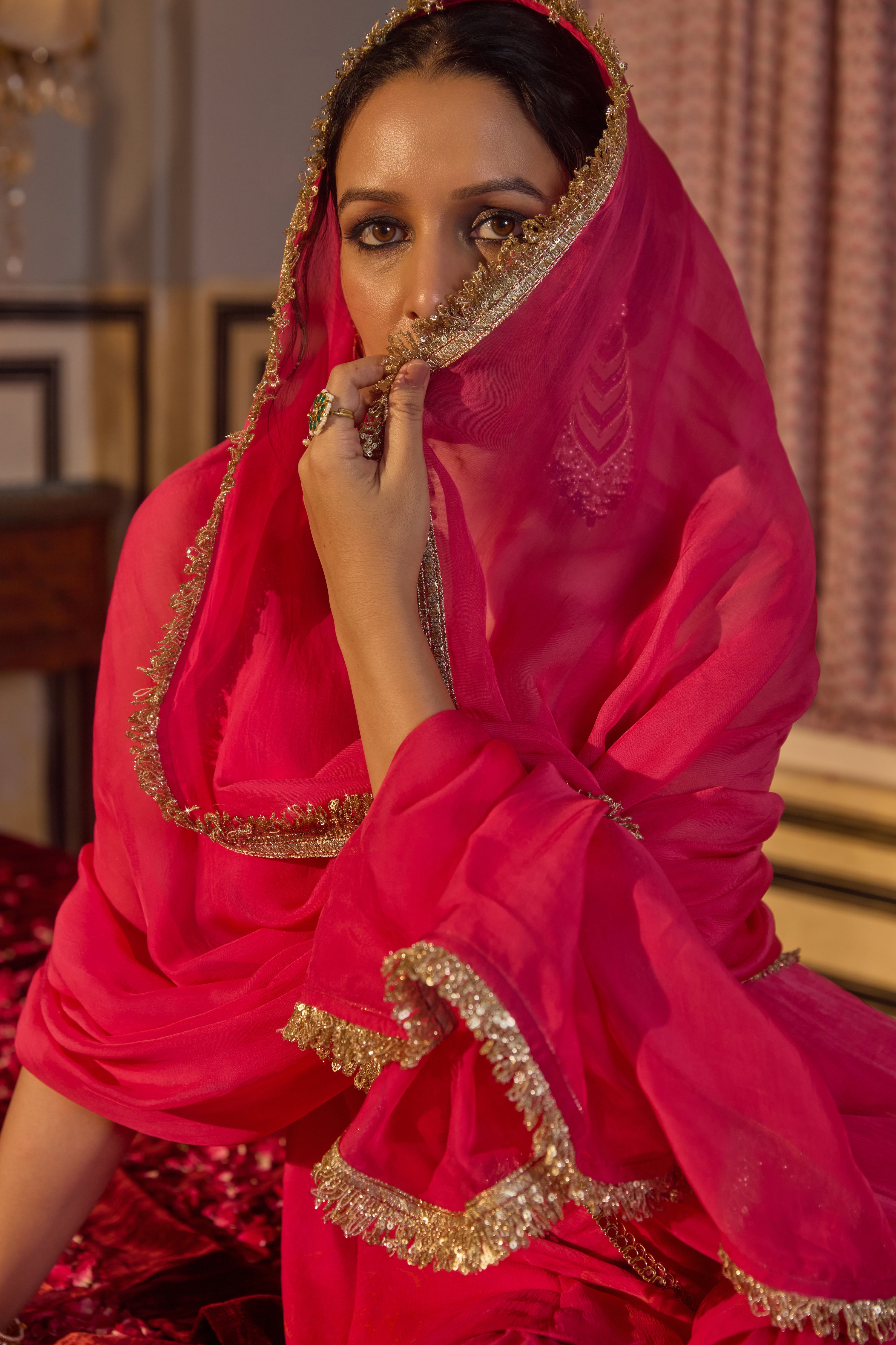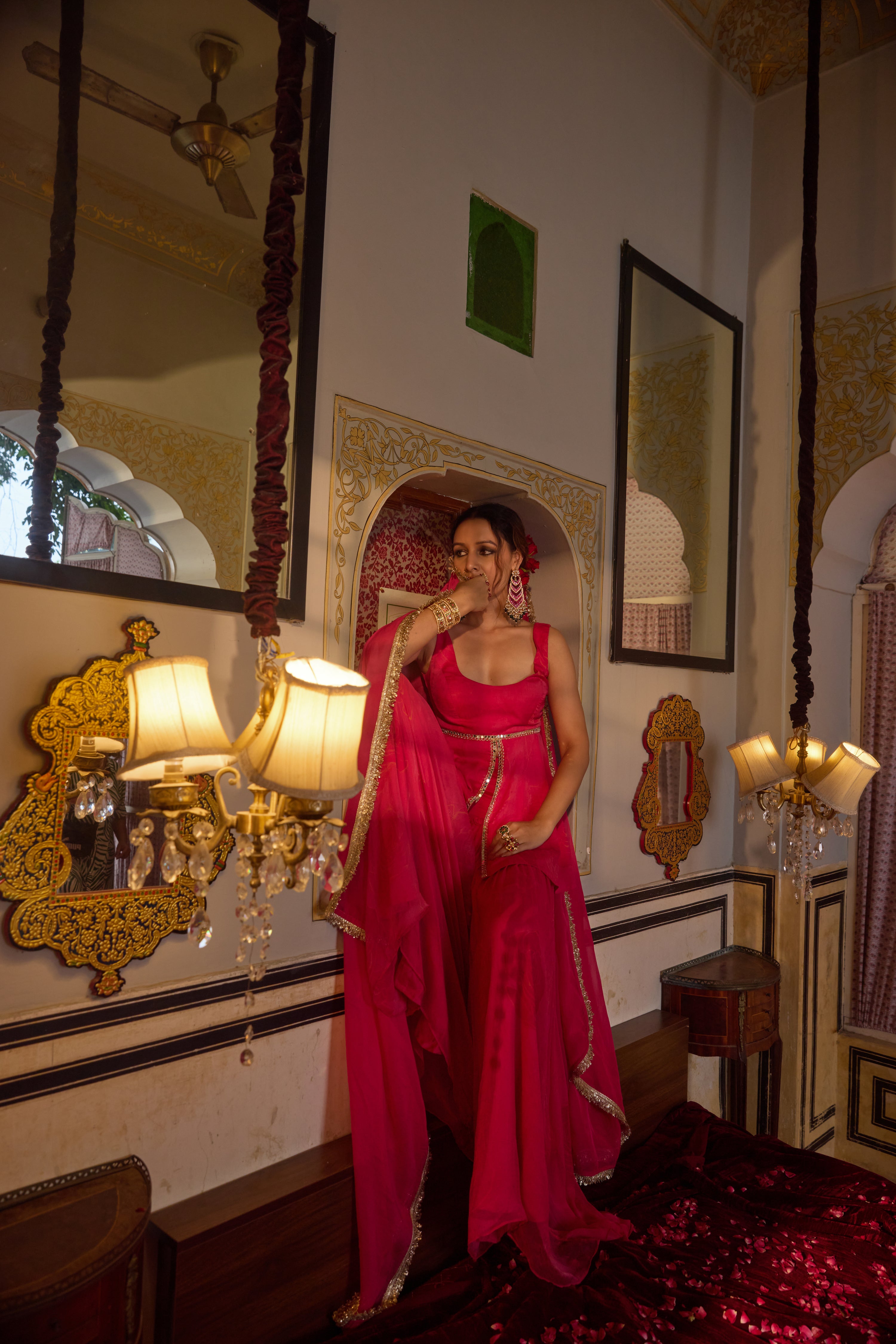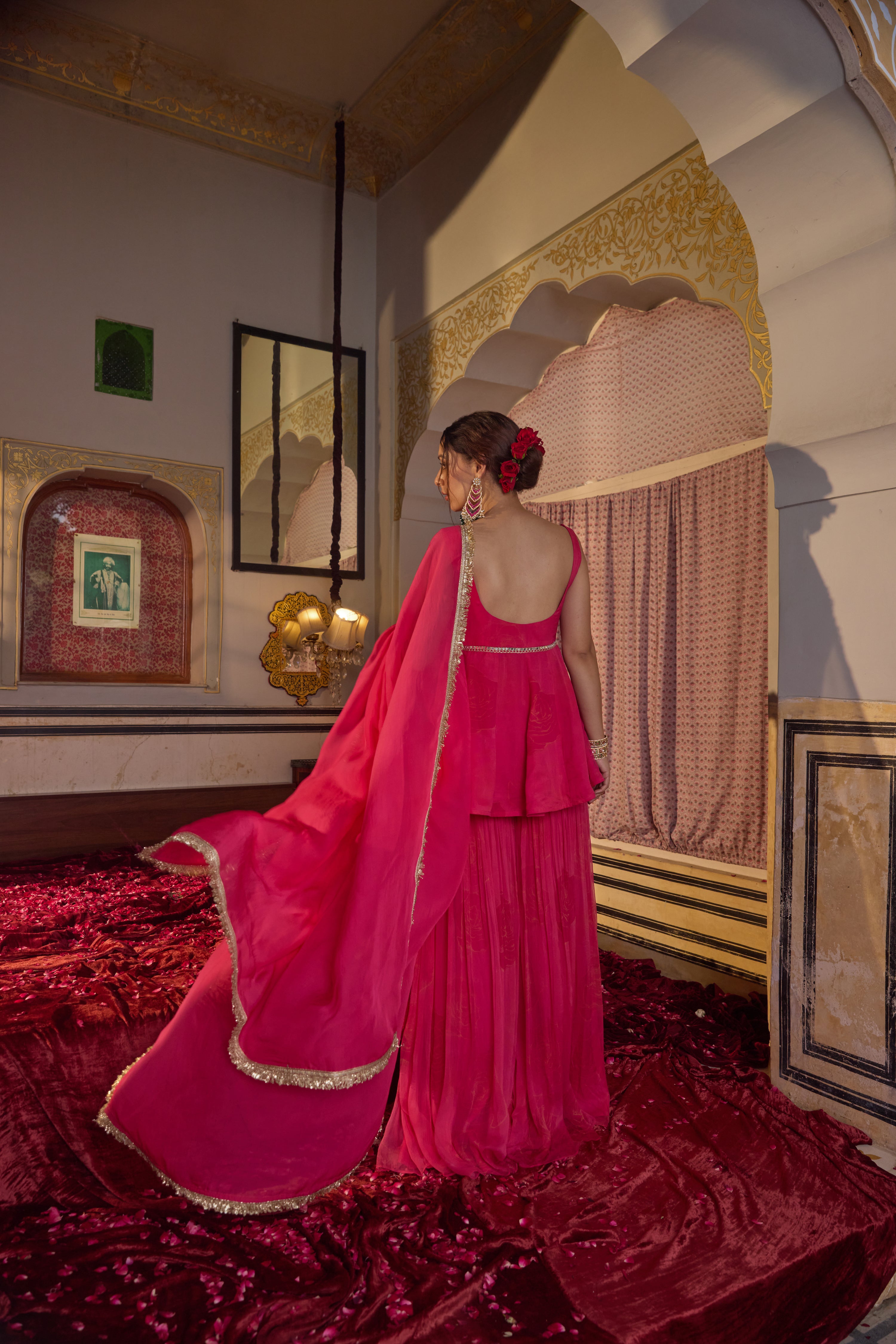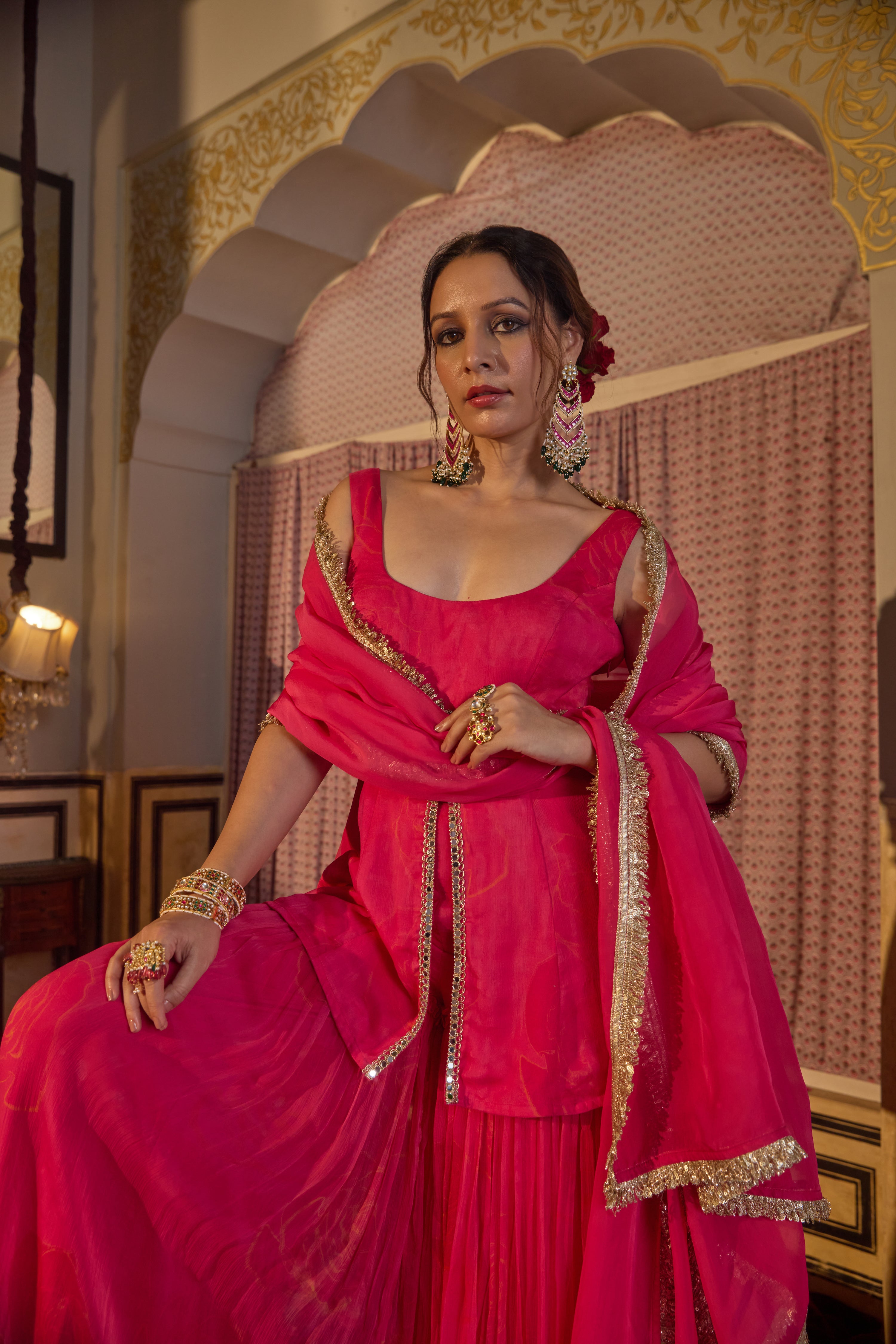 Make a statement with our Peplum Gharara Set—a printed chiffon peplum with lacework, paired with a matching gharara and flowing organza dupatta for effortless elegance. The lightweight chiffon and the thoughtful detailing make it an ideal choice for those who appreciate both style and tradition. elevate your ethnic wardrobe with this stunning peplum gharara set that promises to turn heads at every event.